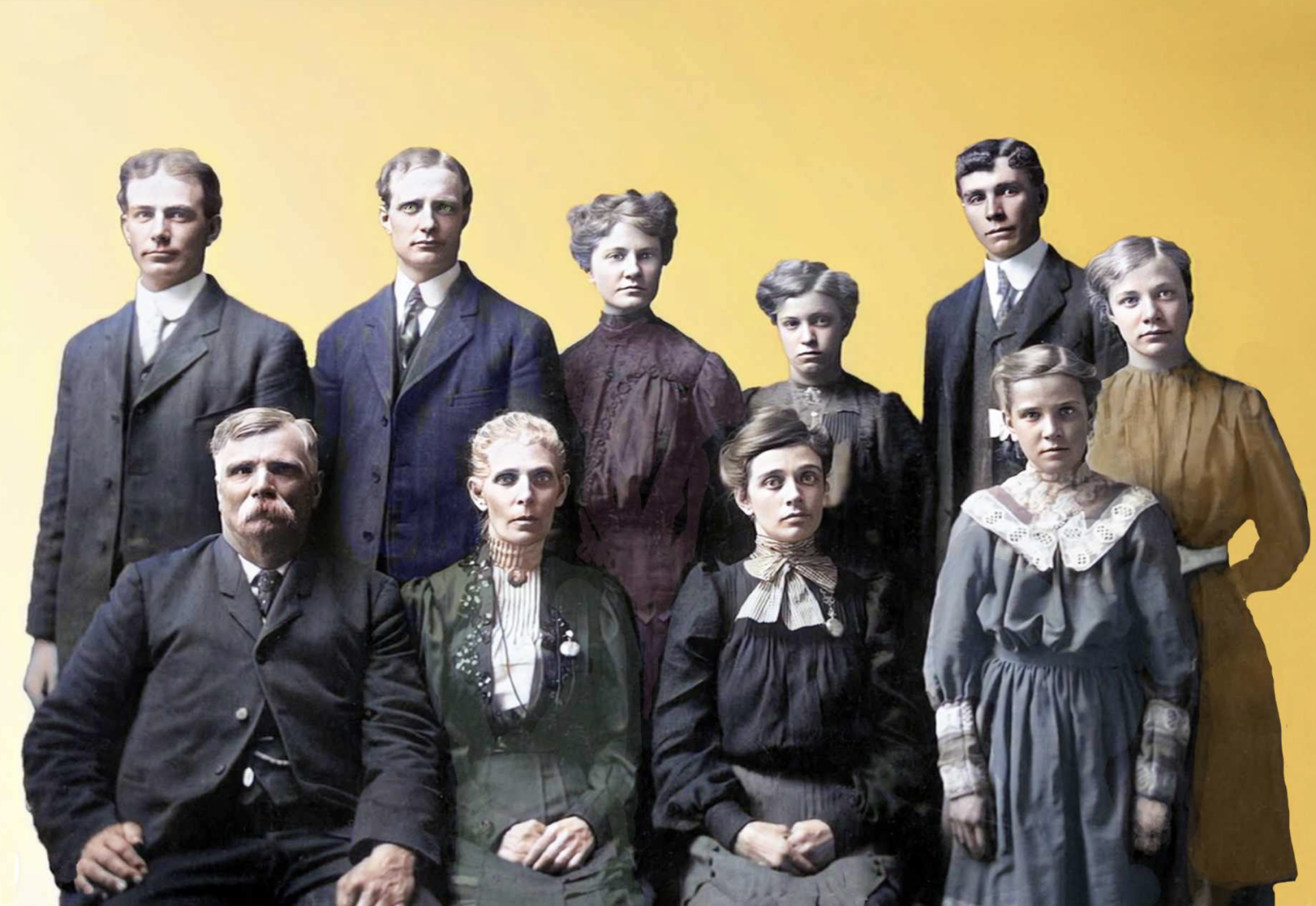 Erastus is on the front row, left.Next to Erastus is his wife, Geneva Eleanor Telford.Geneva is a blood relative of Allen Hackworth.Second person, left side, back row isWilliam E. Gee, Loni's grandfather.