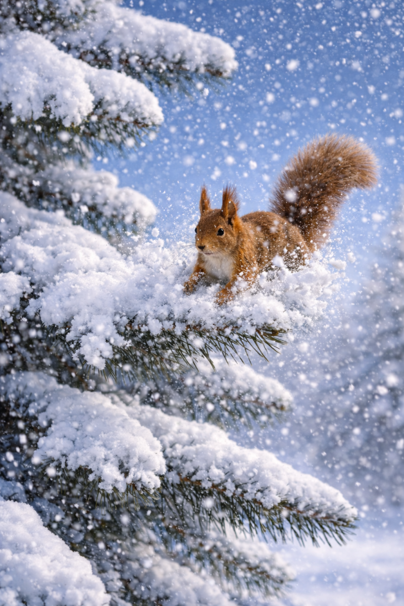 Silhouetted against a roof, a brown squirrel leaped